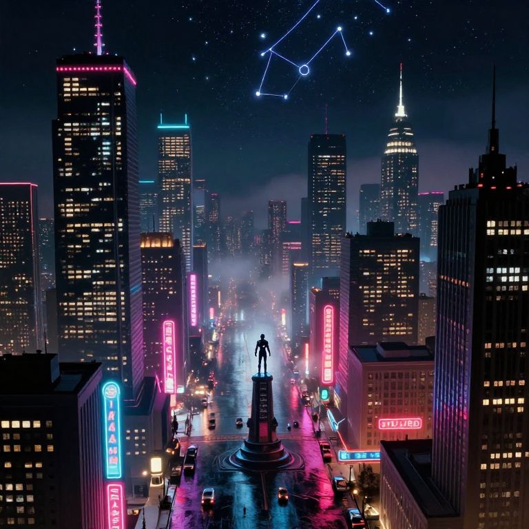 Craft an image reminiscent of vintage sci-fi posters, portraying a futuristic metropolis at night from a lofty perspective. This cityscape is adorned with towering skyscrapers illuminated by neon signs displaying cryptic messages and vibrant, pulsating lights that cast mesmerizing reflections on the rain-slicked streets below. In the heart of this urban maze stands a lone figure clad in an advanced exosuit atop a pedestal, contemplating the enigmatic constellations visible through the city's smoggy shroud. The scene should encapsulate a blend of nostalgia and visionary technology, evoking a sense of wonder and intrigue to captivate viewers' imaginations.