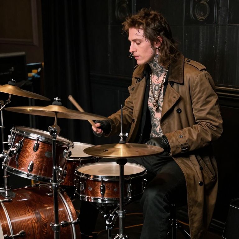 A tattooed drummer in a long coat and gloves, with a mix of Travis Barker and Jack White's style, plays a drum set in a dimly lit room.