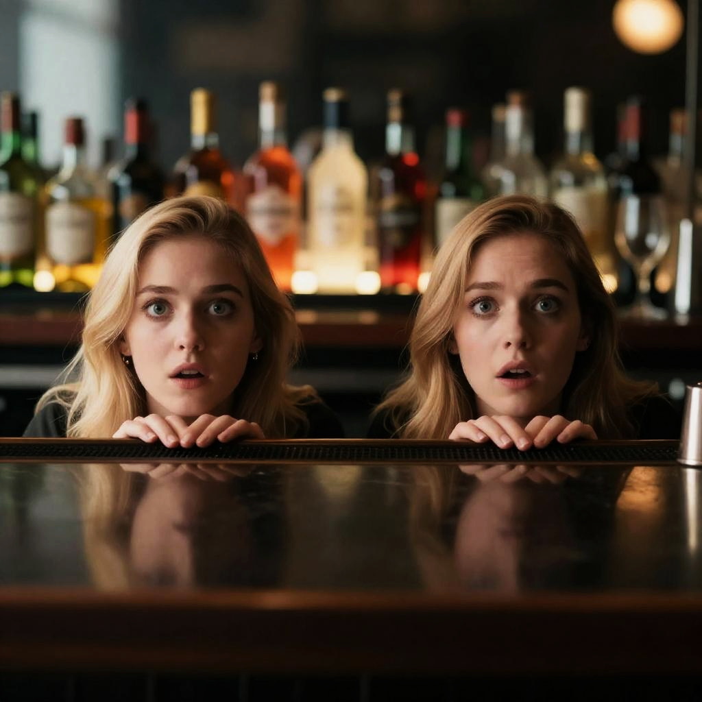 Two women with shocked expressions peeking over a bar counter. Both have blonde hair, wide eyes. Bar behind them has various brightly colored bottles and glasses. Counter is dark, reflective, and ured. One woman on left, other on right.