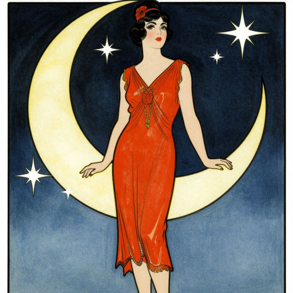 A stylized Art Deco illustration by George Barbier, featuring a woman in a red dress standing against a crescent moon backdrop adorned with stars, evoking a vintage 1920s aesthetic with bold lines and contrasting colors.