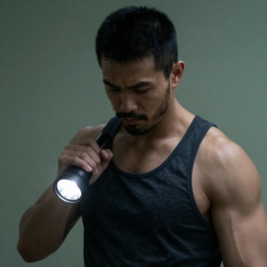 Photograph of a muscular man with short black hair and a beard, wearing a dark gray tank top, holding a bright flashlight in his right hand. Green, blurry background. His face is shadowed, with a focused expression. One person.
