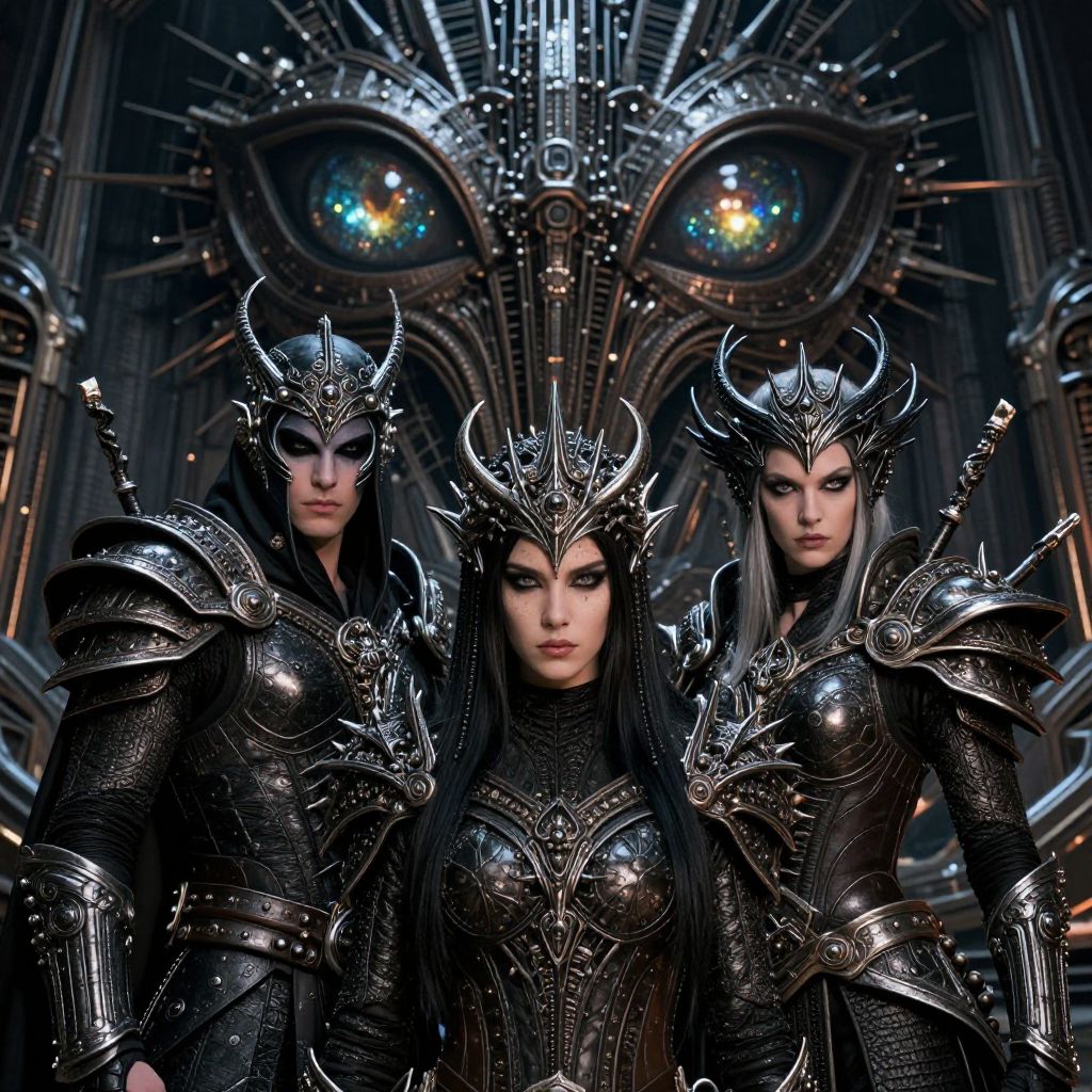 Three women in ornate, black, metallic armor with crowns, standing in a dark, futuristic cathedral with glowing, circular eyes. (Digital Art