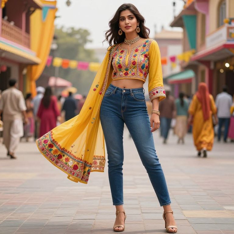 An influencer embracing a modern Punjabi look featuring a hand-embroidered phulkari top and tailored denim trousers, standing in a vibrant city plaza with vibrant festival colors, dynamic action, high-resolution, detailed fabric textures, MidJourney style.