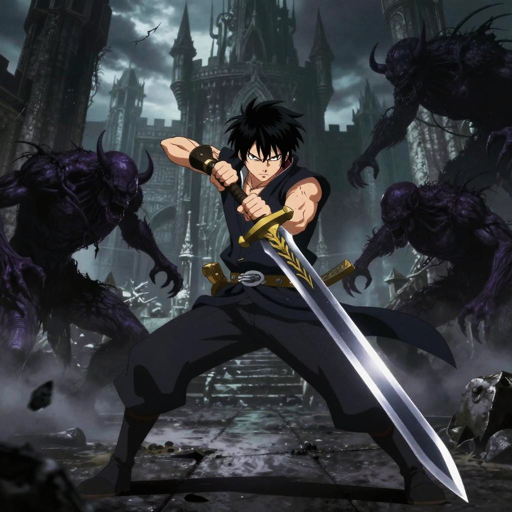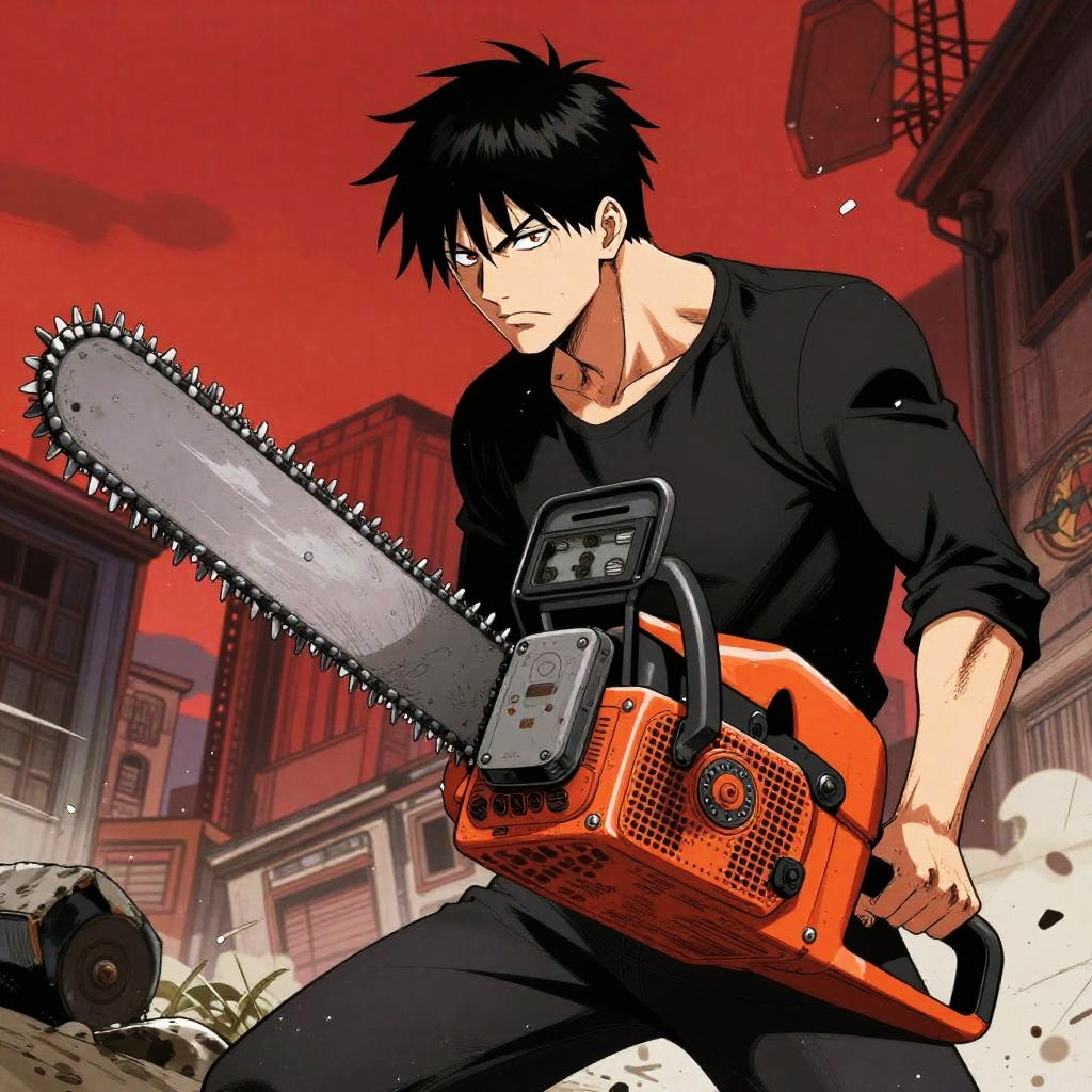 Chainsaw man art style, chaotic cityscape filled with debris and smoke, protagonist with chainsaws integrated into limbs, energetic motion blur effects, sharp angular features, vibrant yet grim color tones