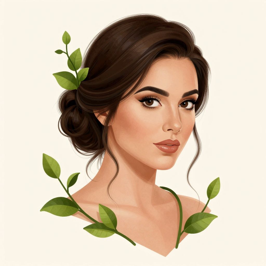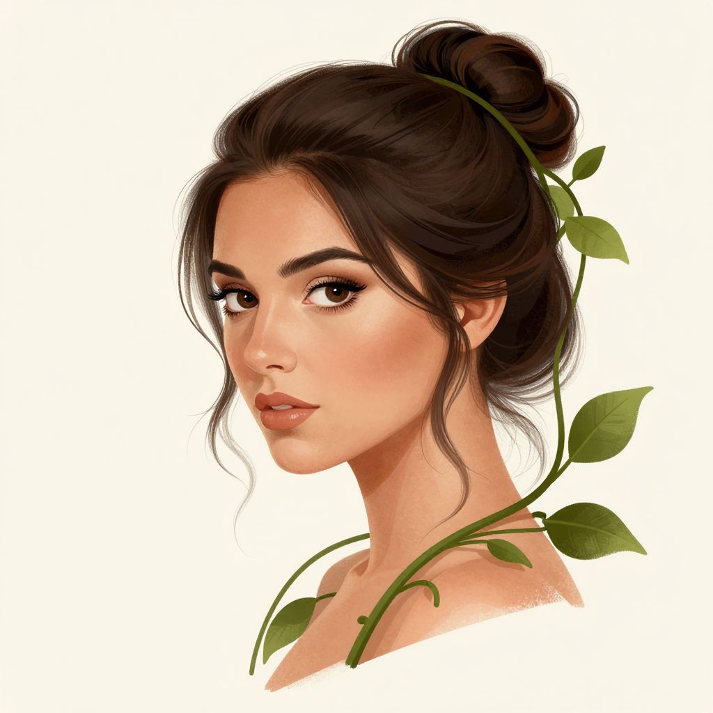 Digital illustration of a beautiful woman with dark brown hair in a bun, adorned with green leaves, staring confidently. White background. Realistic, semi-real