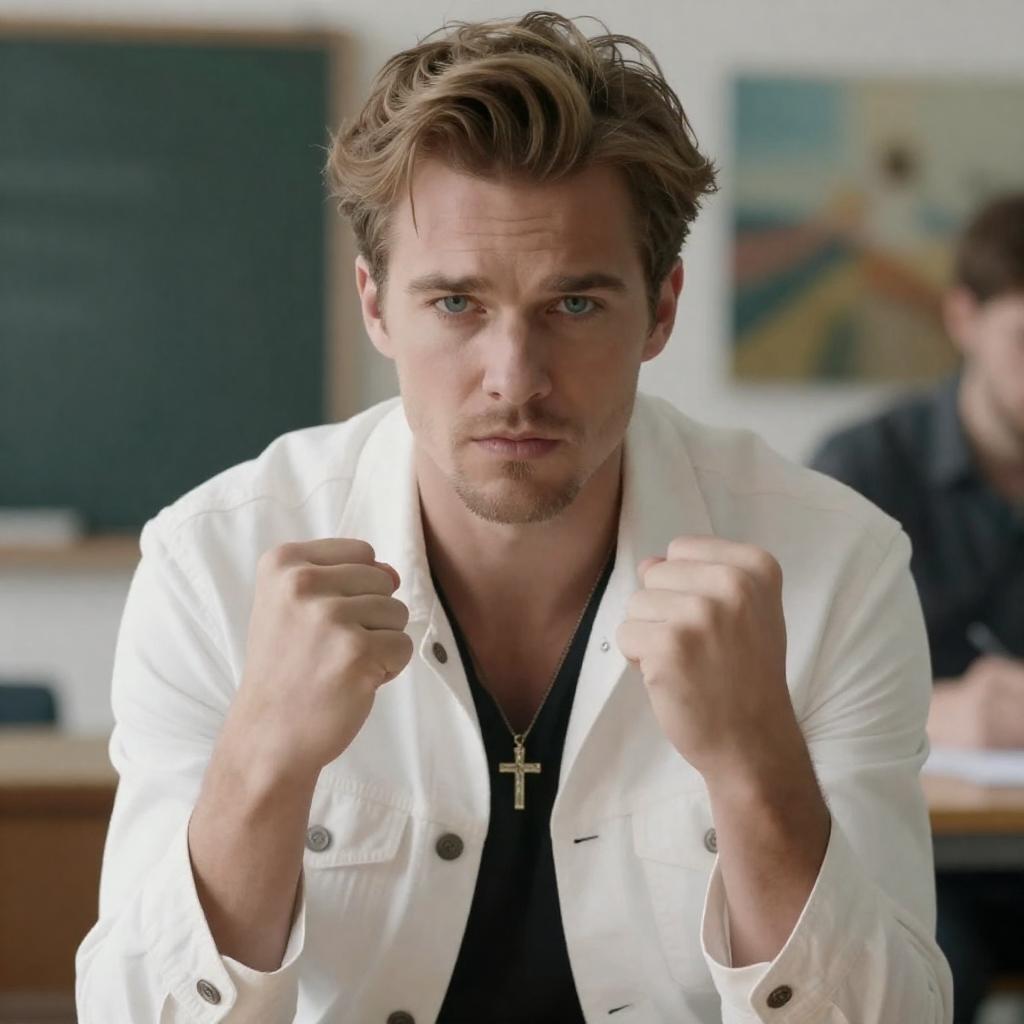 Photograph of a man with light brown hair, styled up, wearing a white jacket over a black shirt with a cross necklace. He has intense blue eyes, clenched fists near his chest, looking slightly to the side. Blurred background with a dark green object and a painting. Another person is partially visible in the background.