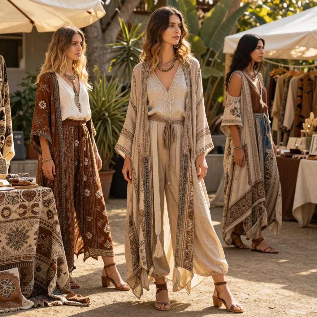 Fashionable bohemian outdoor market scene, women and men wearing flowing layered clothes in earthy colors and intricate patterns, sunlit with warm golden hour light, surrounded by handmade crafts and plants, relaxed yet couture-inspired look