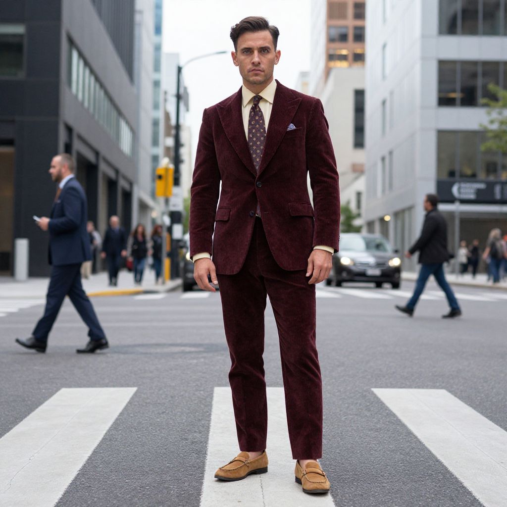 A man, rich burgundy corduroy suit, tailored silhouette, shawl collar jacket, tapered trousers, ivory dress shirt, patterned silk tie, tan leather loafers, café terraces, sleek office buildings, busy crosswalks, pinhole camera style, confident expression. Man has masculine face and piercing eyes