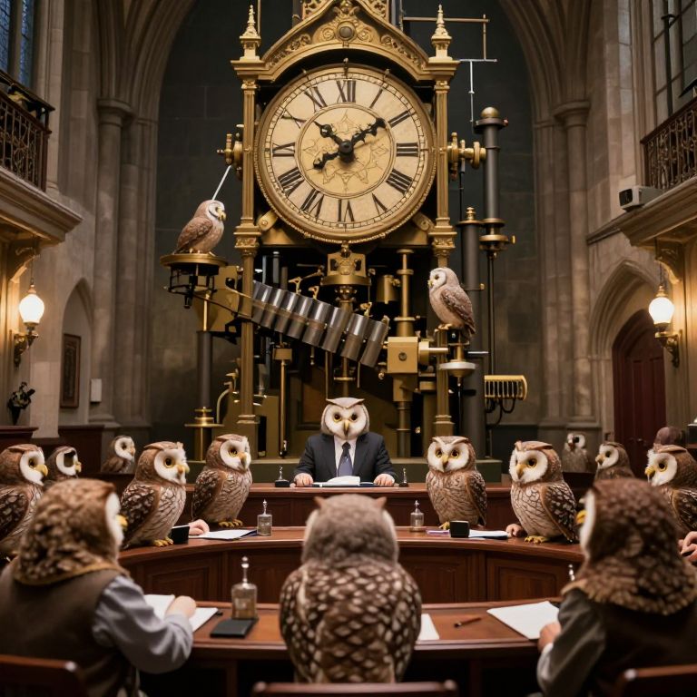 A parliament of owls engages in a heated debate inside a clockwork cathedral, votes cast in rhythmic hoots and mechanical chimes.
