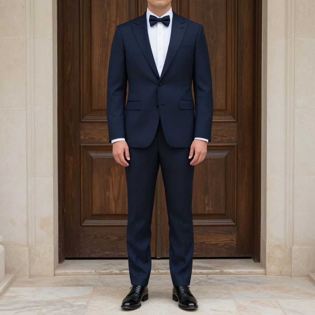 Photograph of a man standing in front of a dark wooden door with a rich, brown texture. He is wearing a classic black tuxedo with a white dress shirt and a black bow tie. His black dress shoes are polished and shiny. The man's face is not visible, focusing on his formal attire. The background includes light-colored stone walls, adding a formal and elegant atmosphere. The image has a sharp, high-contrast look, highlighting the textures and colors.