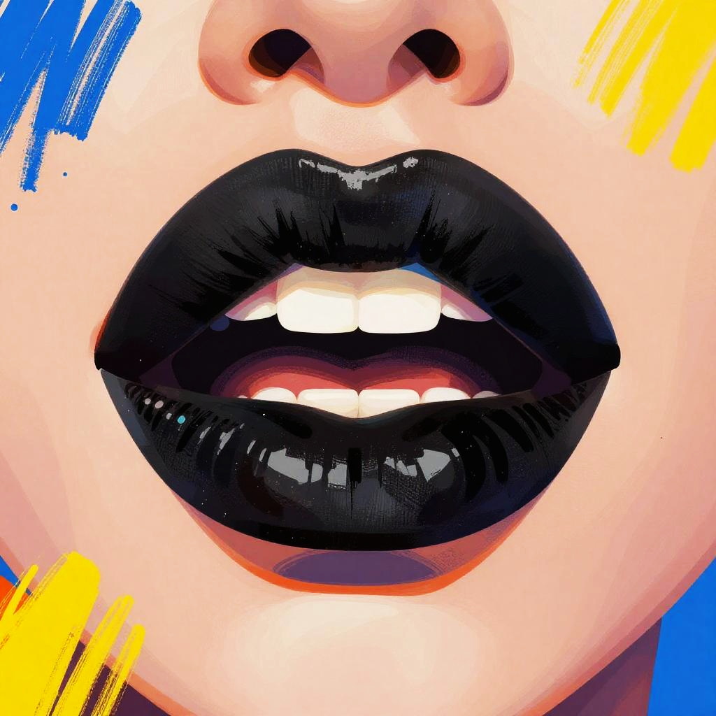 Black big lips, stylized illustration vibrant colors, bold brush strokes, emphasizing volume and shine, modern fashion magazine cover style with dynamic background elements