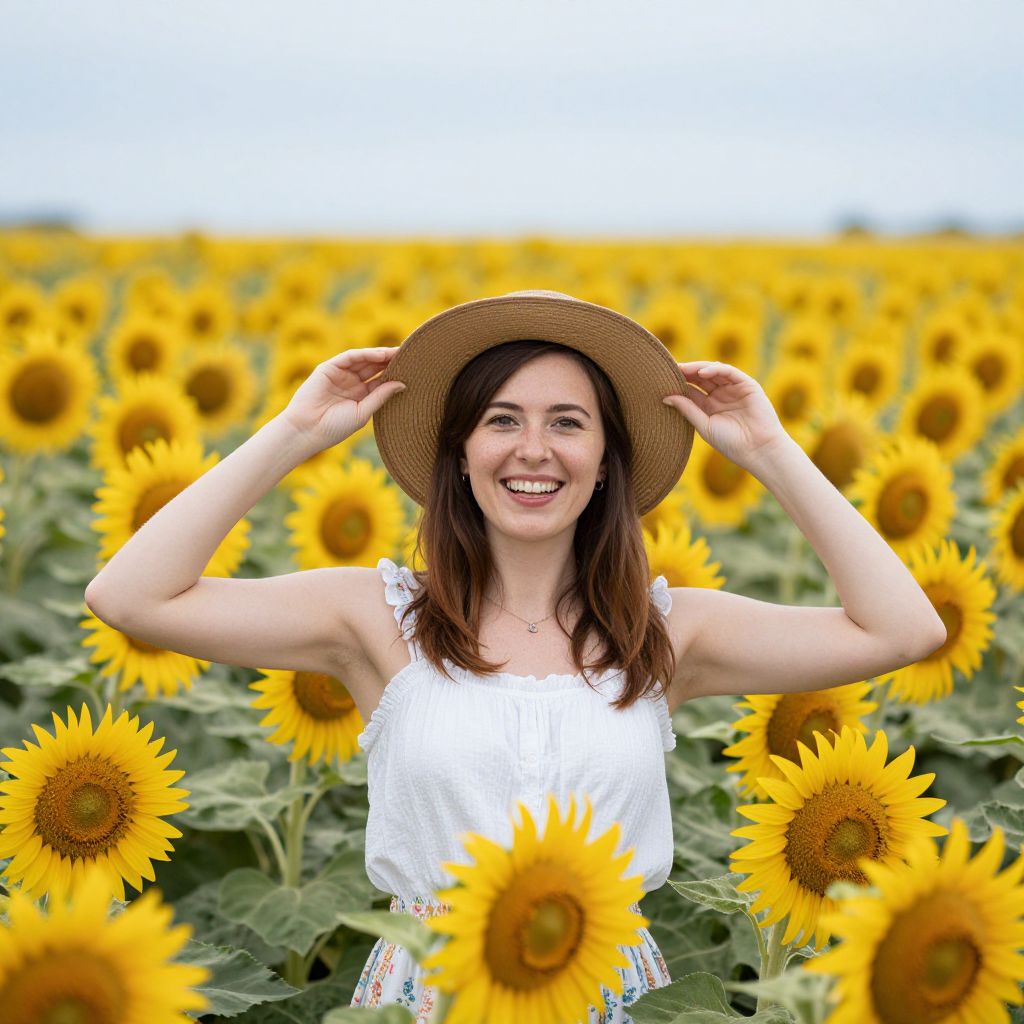 Woman smiling brightly while adjusting her brown sun hat, standing amidst a vibrant sunflower field with golden blooms stretching into the horizon.