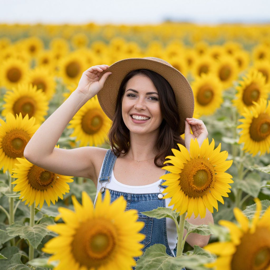 Smiling woman in denim overalls and straw hat standing in vibrant sunflower field, with yellow flowers filling the background. Photograph.
