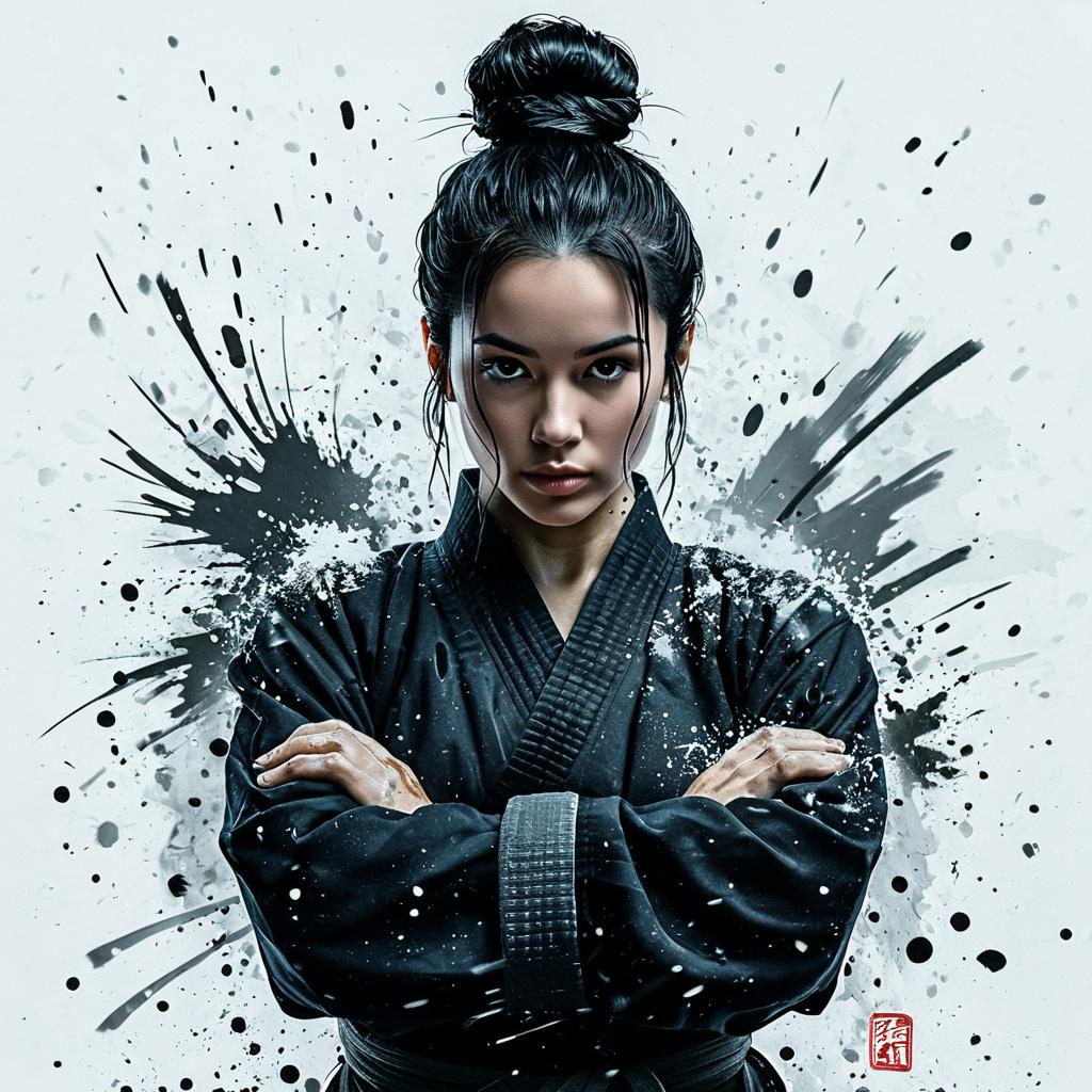 Digital art of a serious Asian woman with black hair in a bun, wearing a black kimono, arms crossed, against a splattered black ink background
