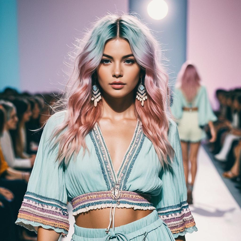 Pastel Hair hairstyle on fashion influencer, wearing bohemian outfit, in fashion runway, captured in fashion editorial style with soft pastel lighting.