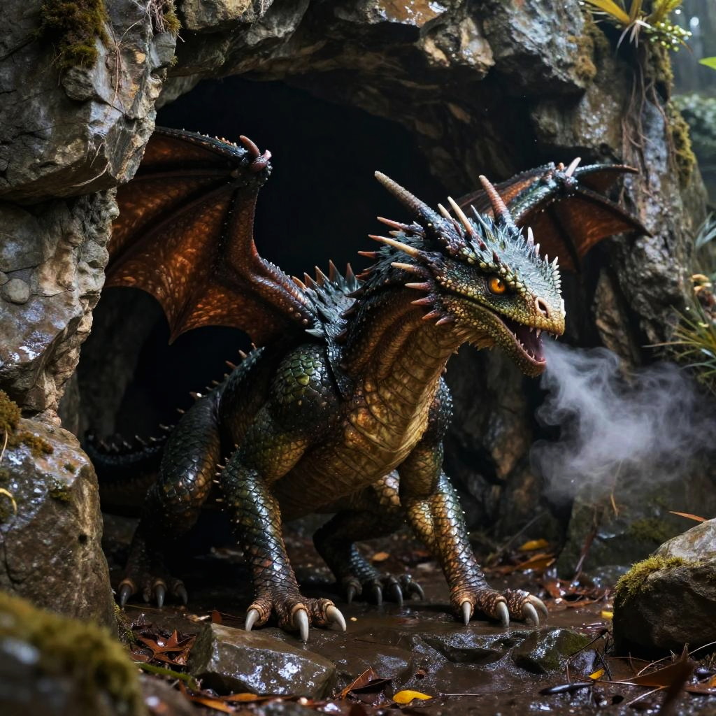 Realistic wyvern emerging from a cave mouth, wet stone surroundings glistening, richly detailed scaly skin in dark green and bronze hues, steam rising from nostrils, intense and lifelike with dynamic pose suggesting imminent flight, fantasy wilderness background with rich textures.