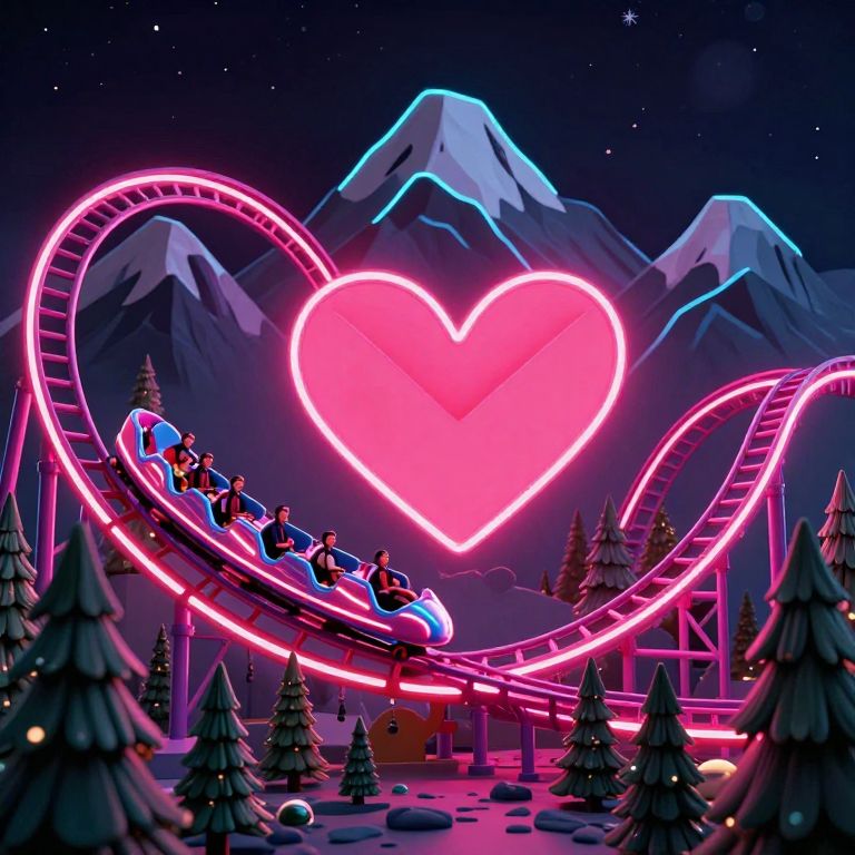 Neon-lit roller coaster with heart-shaped lights curves through snowy mountains, surrounded by stylized pine trees at night. Digital art.
