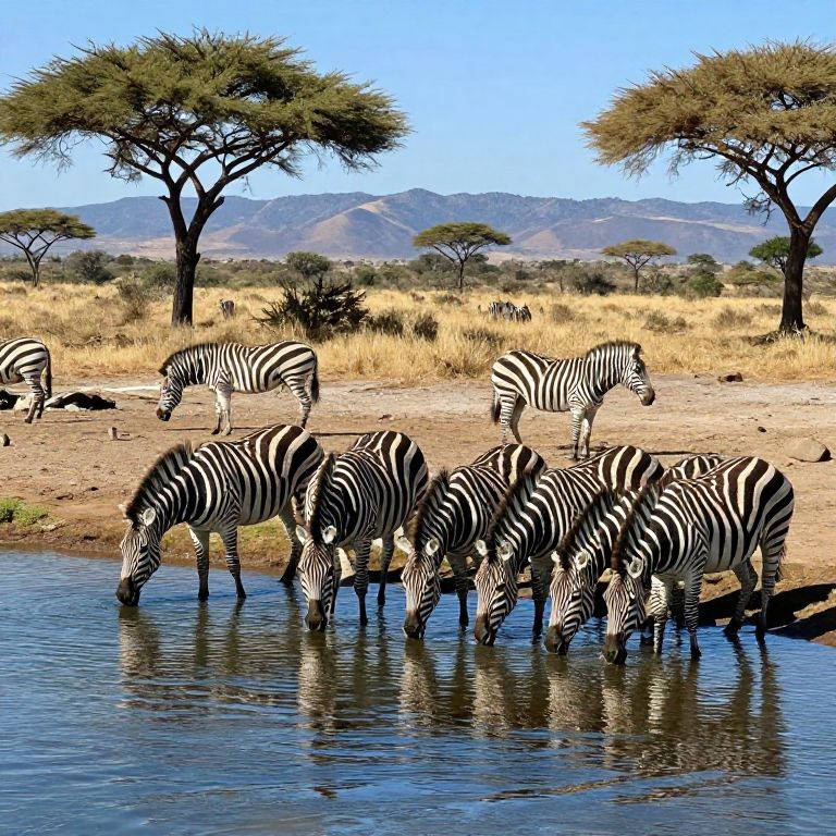 Photograph of a group of zebras drinking from a waterhole in a sunlit African savanna, with acacia trees and distant mountains in the
