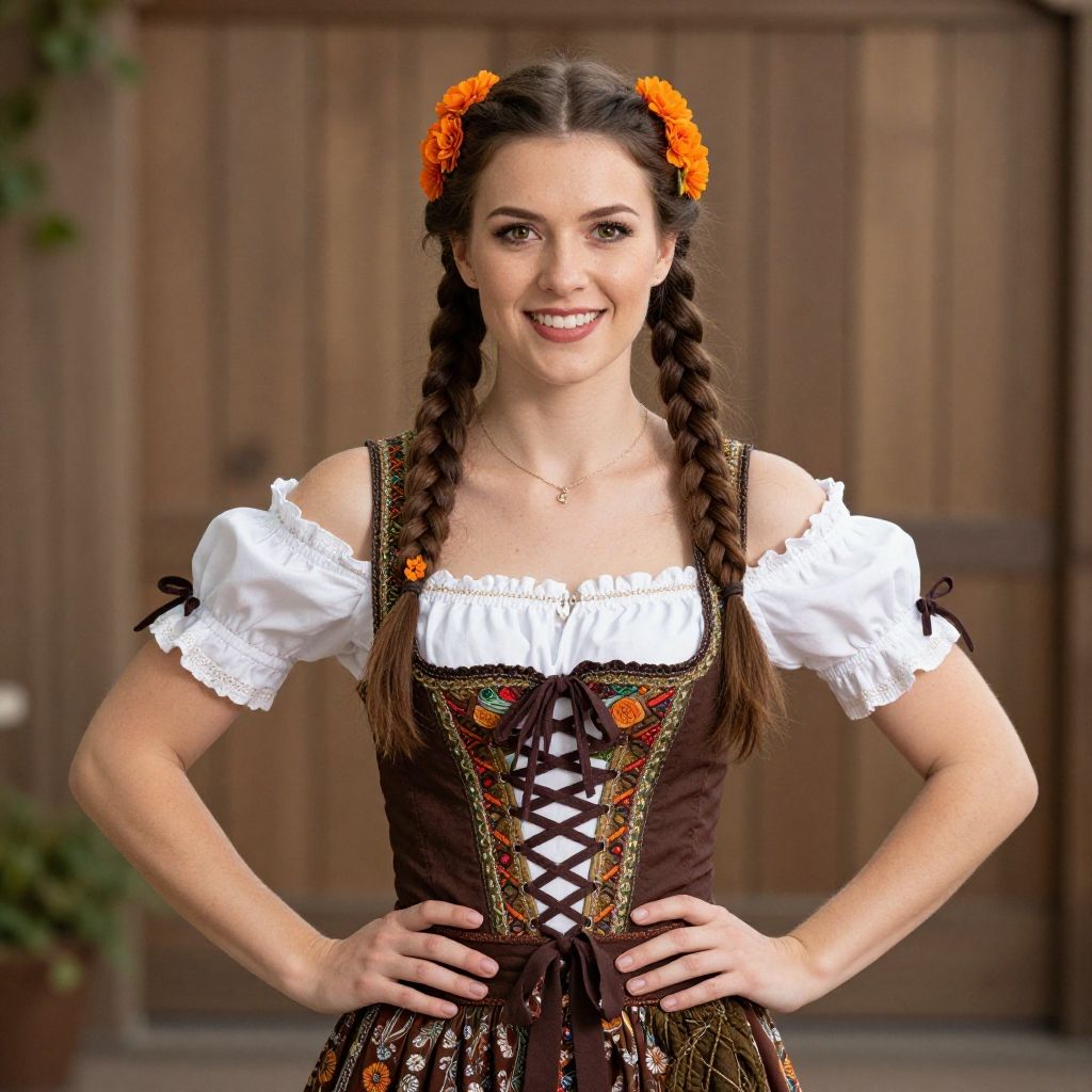 A young woman dressed in a realistic Bavarian beer wench costume poses with confidence, featuring twin braided hair adorned with orange flowers. The traditional dress includes a brown bodice with white ruffled sleeves and intricate lace-up detailing, reflecting authentic German folk style.