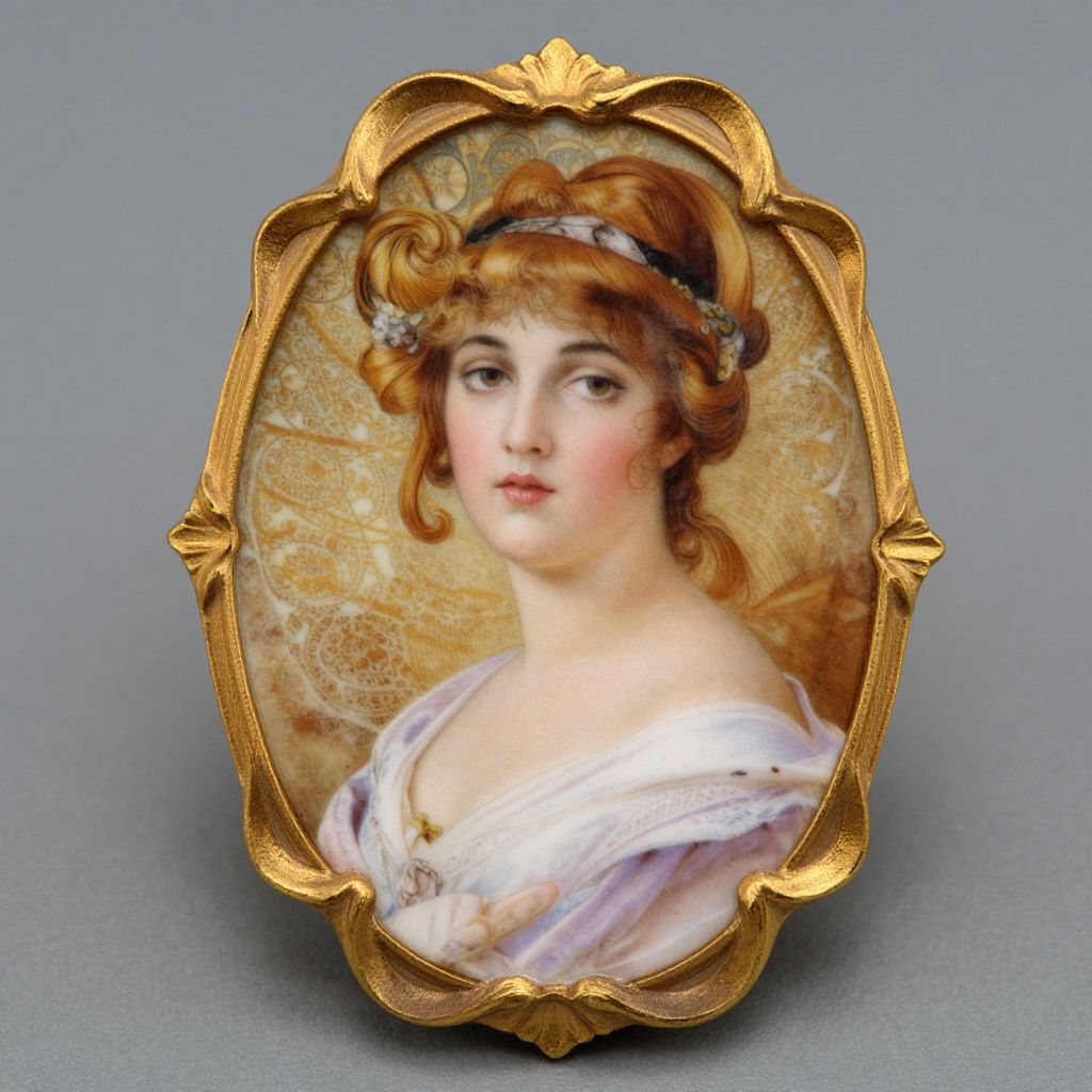 A vintage Art Nouveau brooch featuring a hand-painted porcelain portrait of a woman with scrolled gold detailing, crafted circa 1900-1910s.