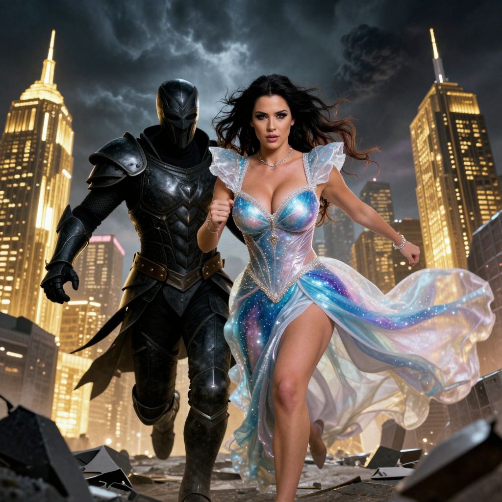 A dynamic scene of a woman in a vivid Heaven vs Hell dual costume running through a fractured cityscape, the light and dark contrast vivid and intense, her face is sharp and bold with defined facial structure and expressive dark eyes, wearing a flowing celestial dress with starry motifs on the right and a shadowy, battle-worn armor on the left, the city shows glowing golden towers against a backdrop of dark smoke and storm clouds, emphasizing the clash between light and dark. The woman has big tits and cute face