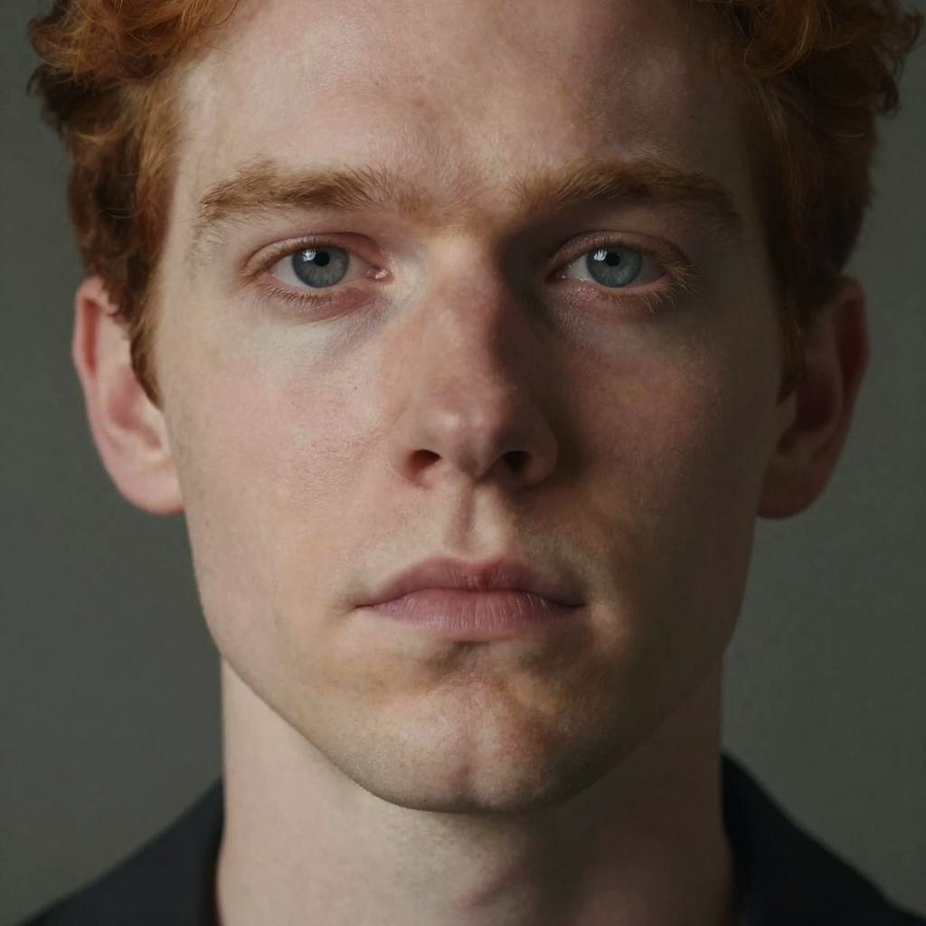 Photograph of a fair-skinned, red-haired man with blue eyes, short curly hair, and light freckles. He has a serious expression with slightly pursed lips and a subtle jawline. His eyebrows are slightly raised, and his gaze is directed straight at the camera. He is wearing a dark-colored shirt, and the background is a plain, gradient gray. The image is a close-up portrait, focusing on his face, with soft lighting highlighting his facial features and creating slight shadows. The overall tone is neutral with a realistic, natural style.