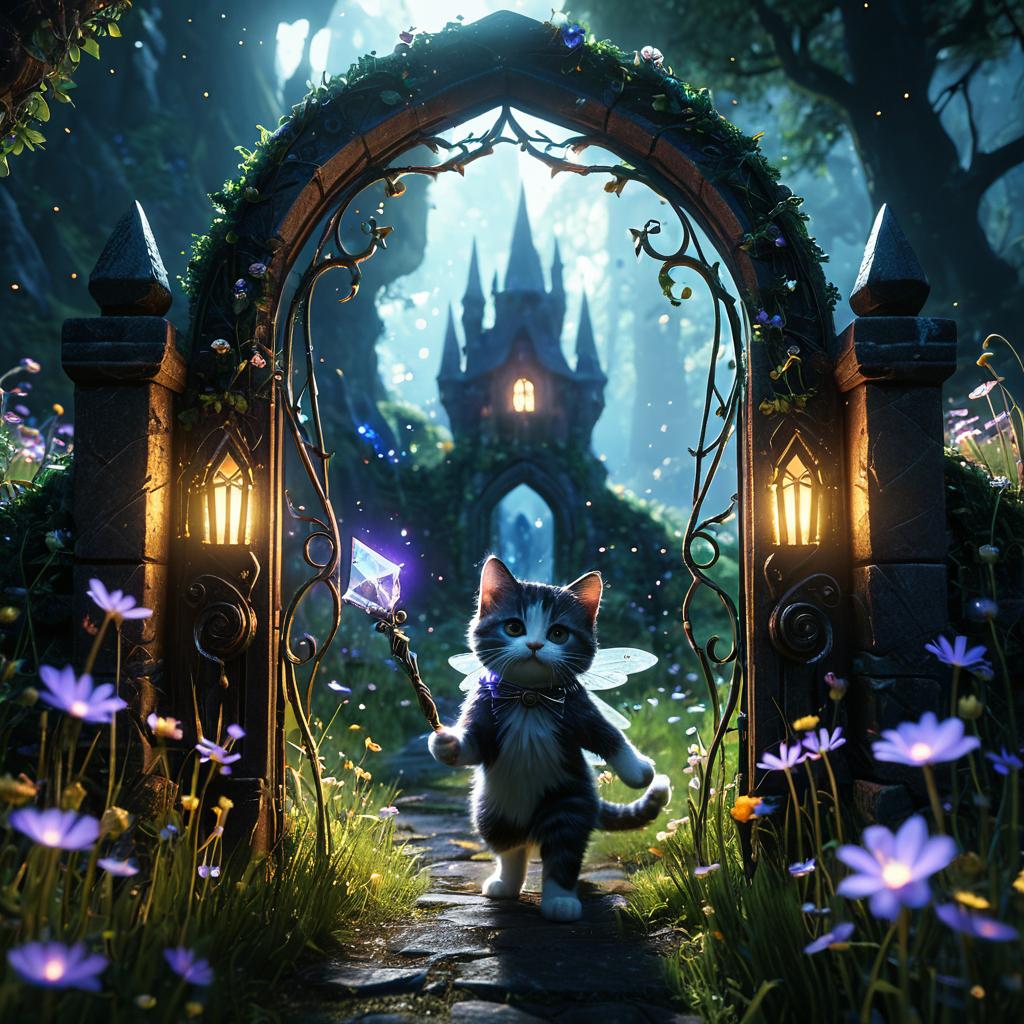 Magical Cat with Glowing Wand in Mystical Swamp