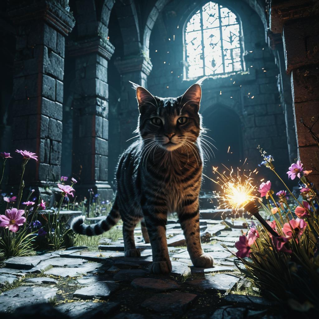 A magical cat defeating a demon with a holy light in a foggy swamp, while holding a wand with flowers emitting light. The scene features octane render, unreal engine 5, volumetric and ambient light, UHD HDR, 4k resolution, ultra-detailed stunning visuals, chromatic aberration, and dark tones.