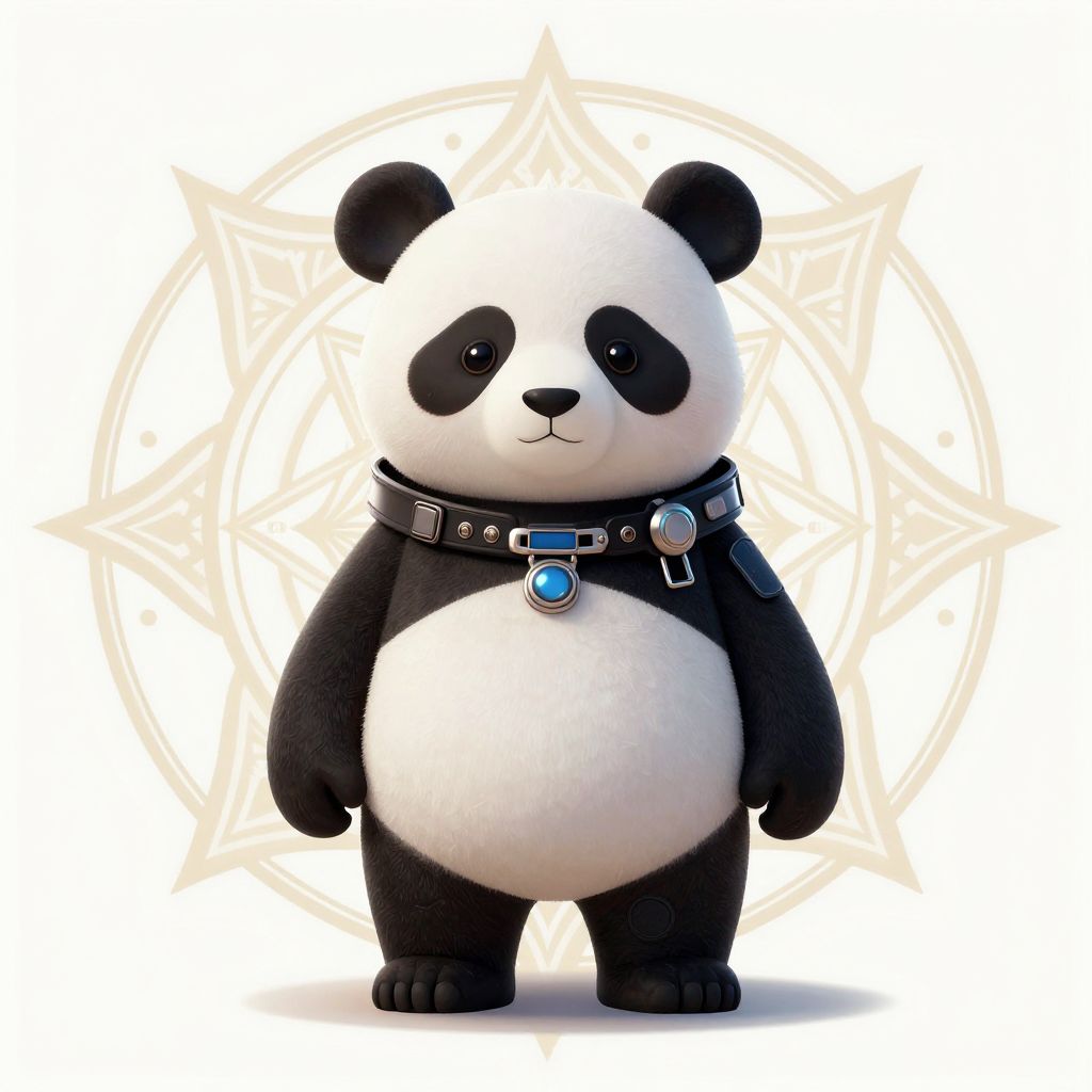 Cute digital illustration of a black-and-white panda wearing a silver collar with a blue gem and lock, standing against a star-shaped background.