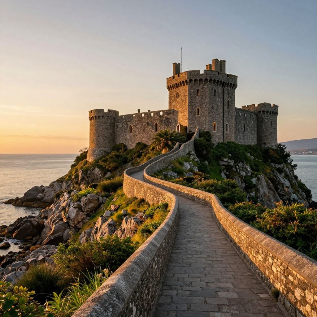 A historic stone castle perched on a rocky cliff overlooking a calm sea during sunset. The scene features a winding stone path leading up to the castle, surrounded by lush greenery and coastal vegetation. The sun casts a warm golden glow over the landscape, highlighting the natural beauty and serene atmosphere of the location.