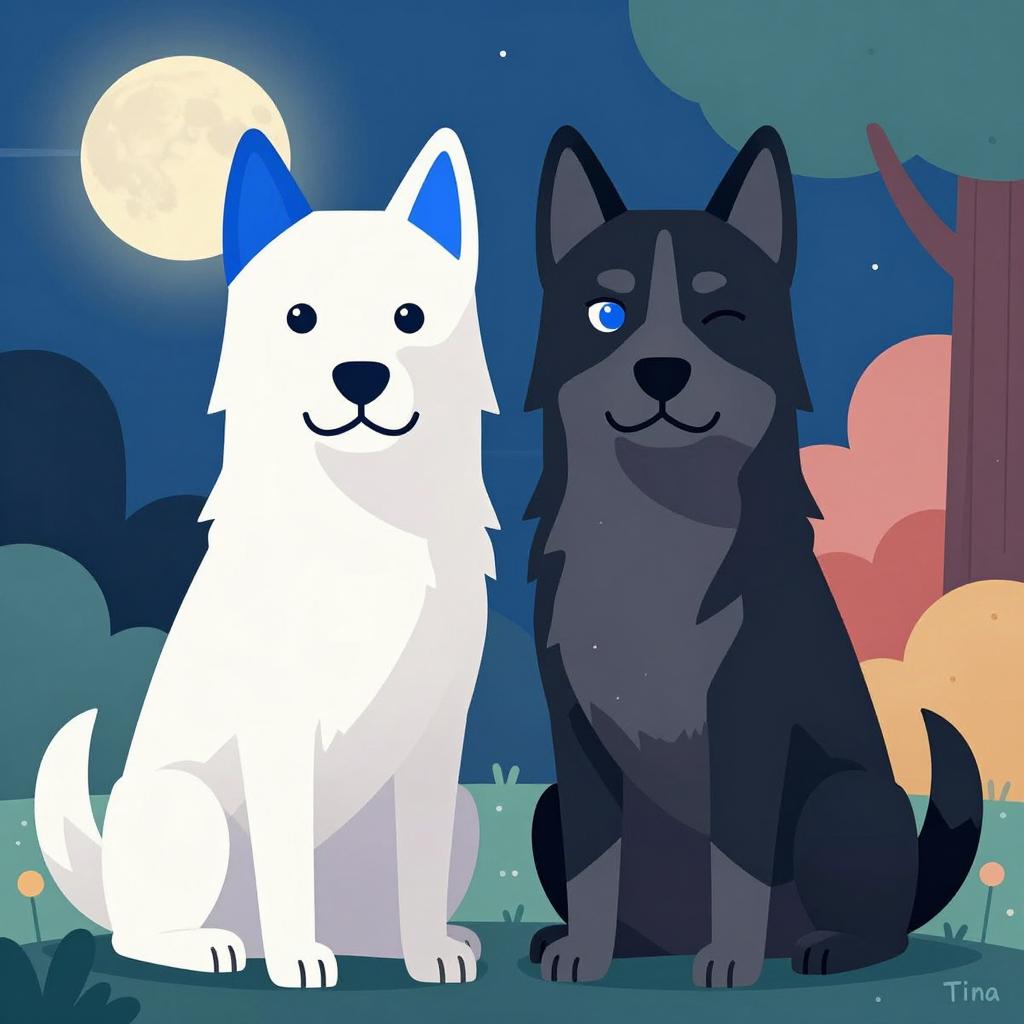 Digital illustration of two stylized dogs. Left dog: white fur, blue ear, alert expression. Right dog: black and gray fur, blue eye, slightly tilted head. Both sit upright, front paws together. Background: colorful abstract night sky with full moon, trees with multicolored leaves. Artist "Tina" in bottom right.