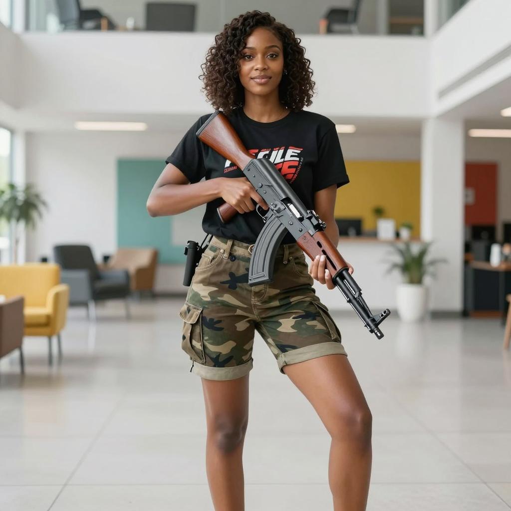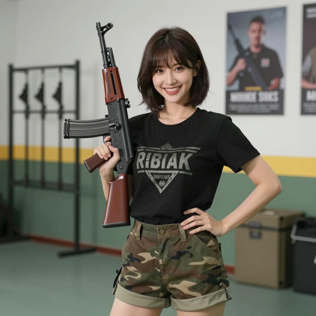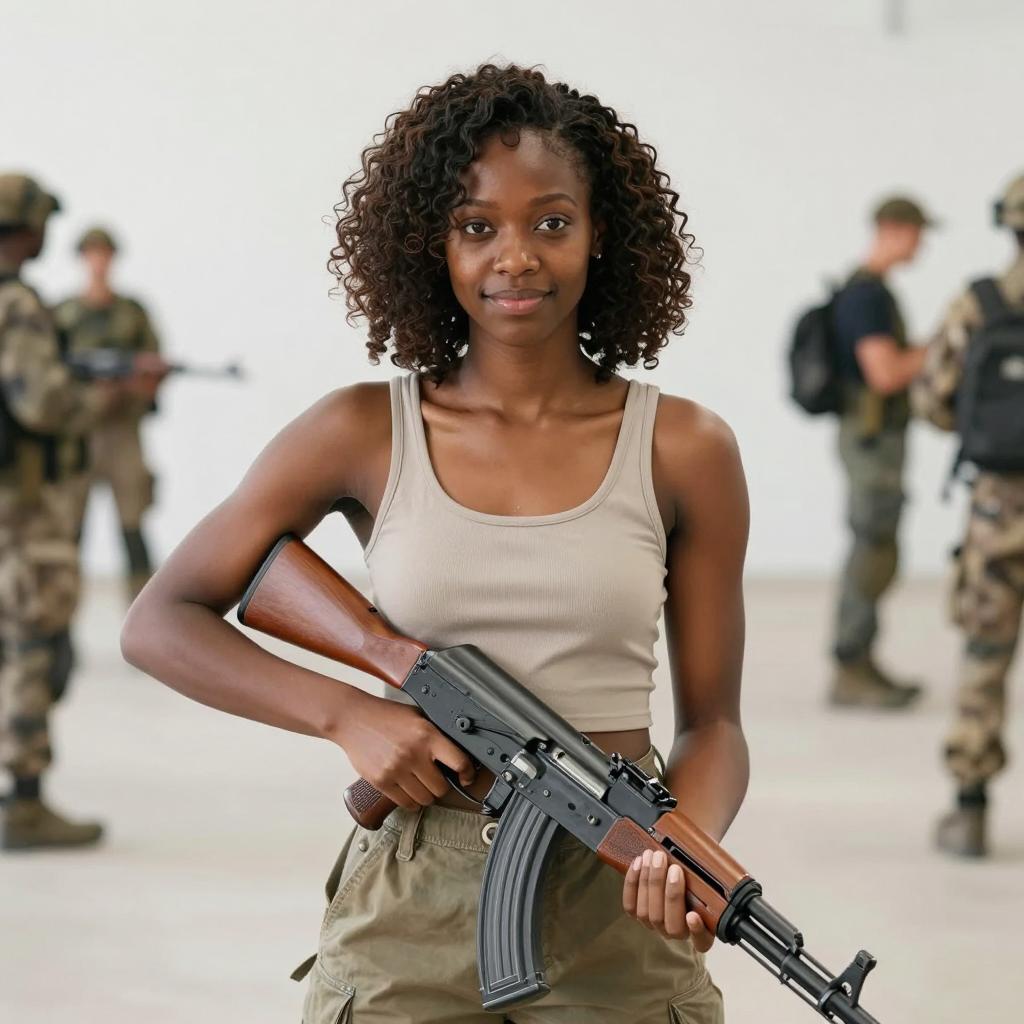 Smiling Woman Holding AK-47 in Training Facility