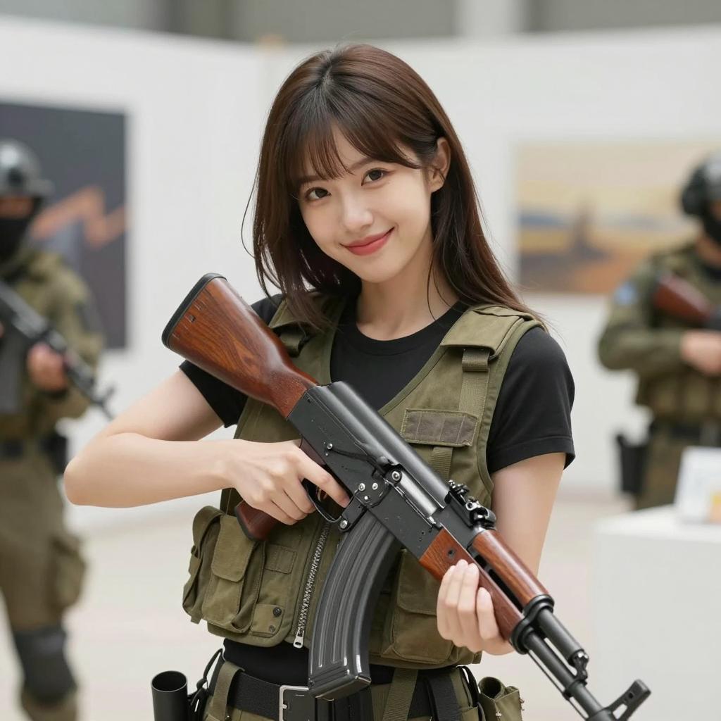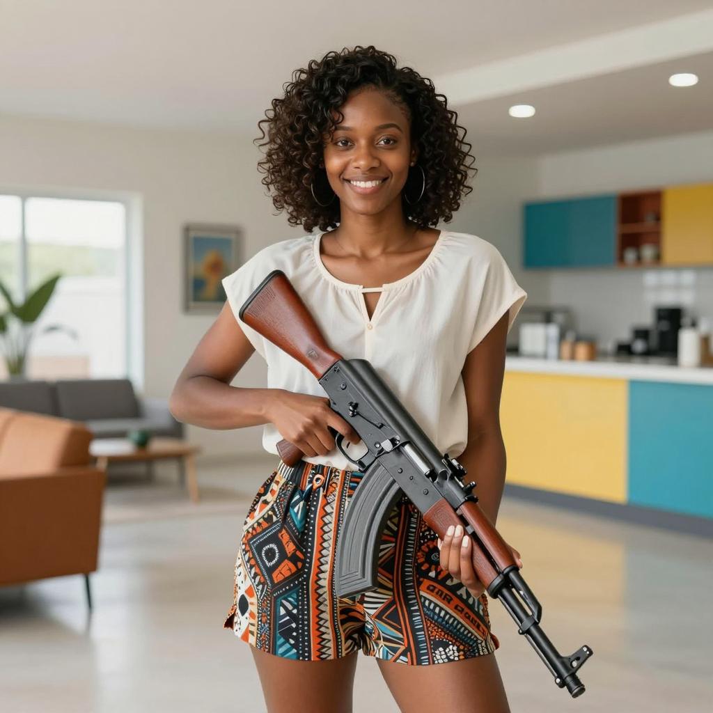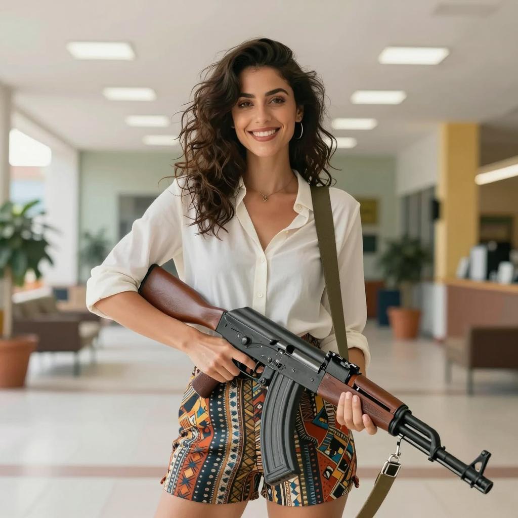Smiling Woman Holding AK-47 in Training Facility