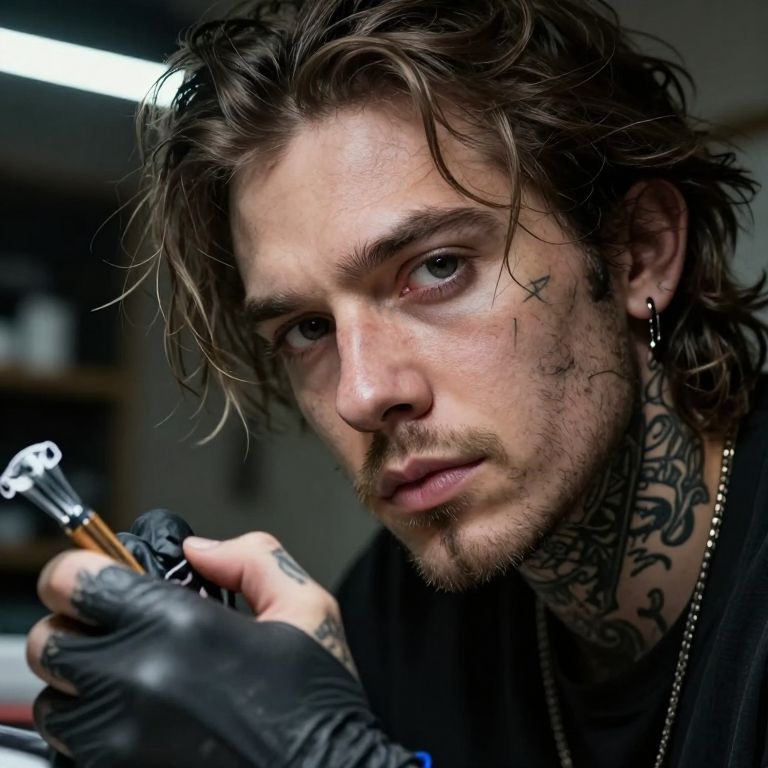 Envision a captivating portrait of an enigmatic tattoo artist, their face bathed in the soft glow of a dimly lit studio. The subject's intense gaze and thoughtful expression reveal a deep passion for their craft. Framed by tousled hair and adorned with their own tattoos, they exude artistic intensity. From a low angle, focus on the intricate details of their facial features and unique skin texture, capturing the depth of emotion and dedication in this hyperrealistic close-up portrait that celebrates the essence of true artistry.
