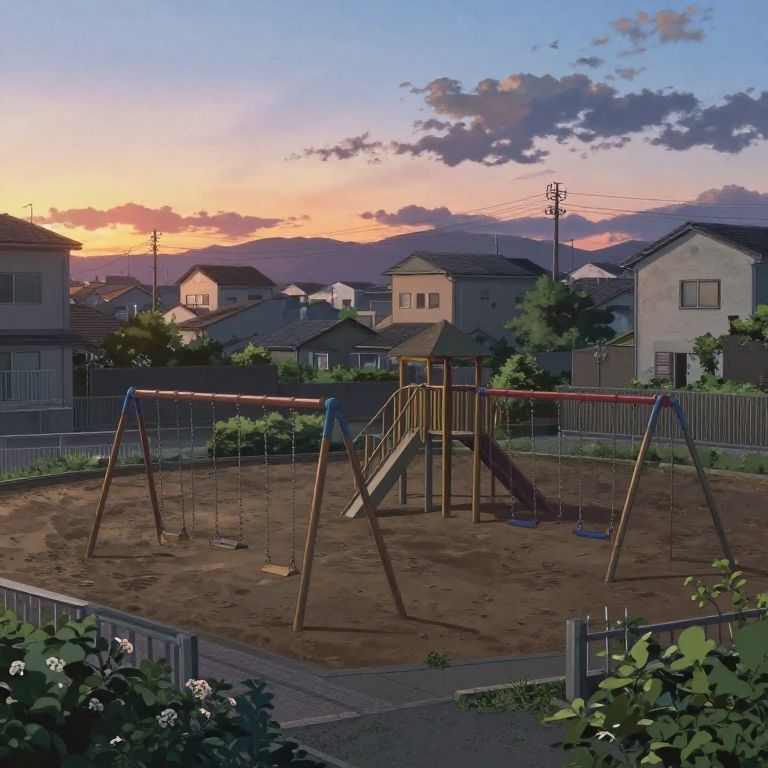 Realistic A large playground, in sunset, swings, and jungle gym in the middle of a residential neighborhood in Japan, peace but misterious feeling, anime bg, matte painting, style of shinkai makoto,