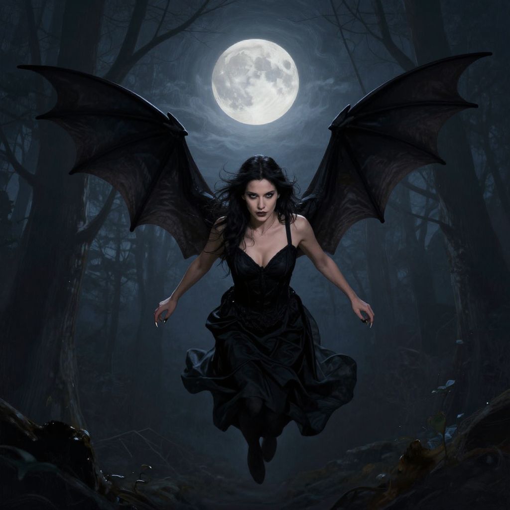 Woman with bat wings flying through a moonlit sky over a dark forest, flowing black dress, sharp claws, piercing gaze, ethereal and mysterious atmosphere, digital painting style