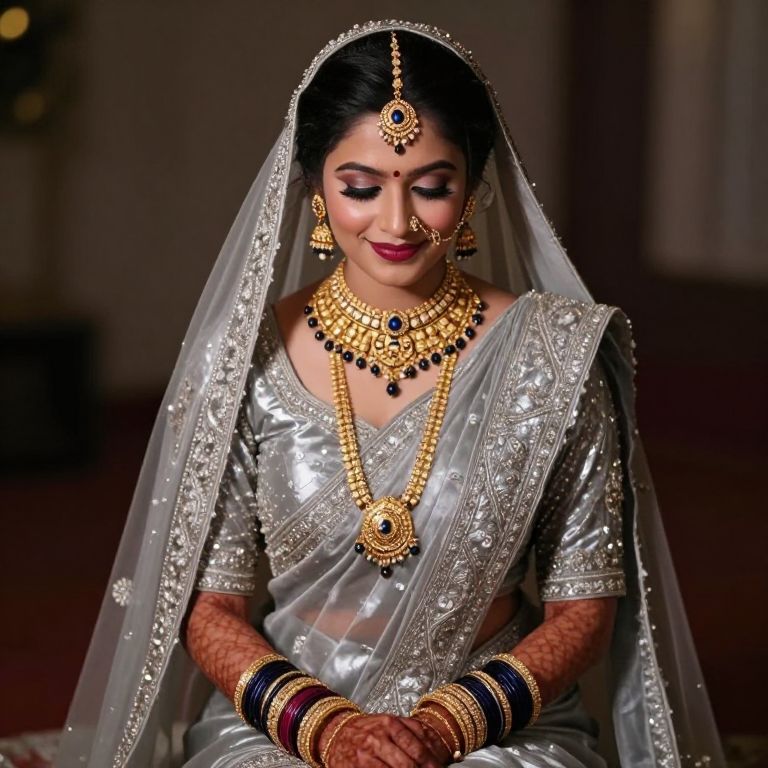 Photograph of a South Asian bride in traditional attire, seated and looking down with a soft smile. She wears a shimmering silver bridal saree with intricate embroidery, a matching veil, and elaborate gold jewelry including a maang tikka, necklace, and bangles. Her makeup is dark and dramatic, with bold eyeliner and deep red lipstick. The background is blurred and dim, keeping the focus on her.