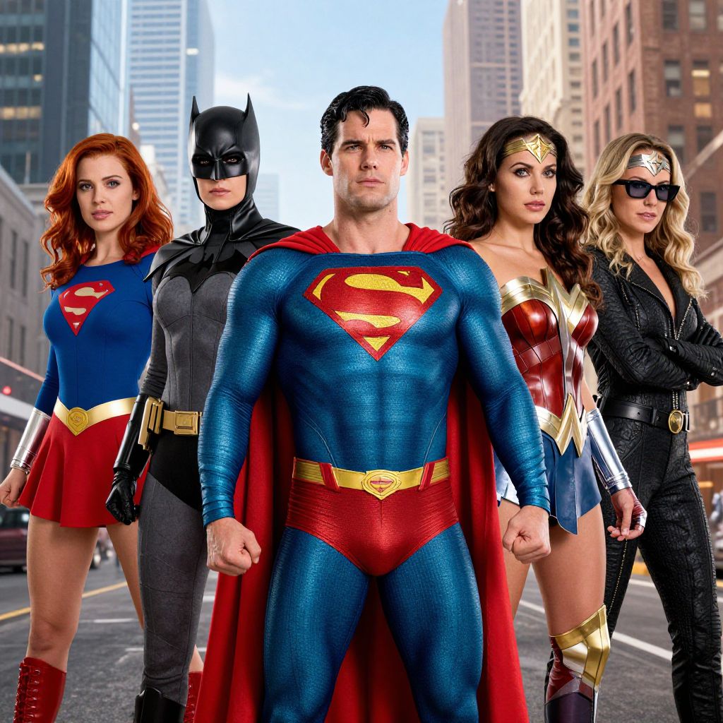 Superheroes stand united in a cityscape, featuring Superman at the center flanked by Supergirl, Batwoman, Wonder Woman, and Catwoman, all poised and ready for action.