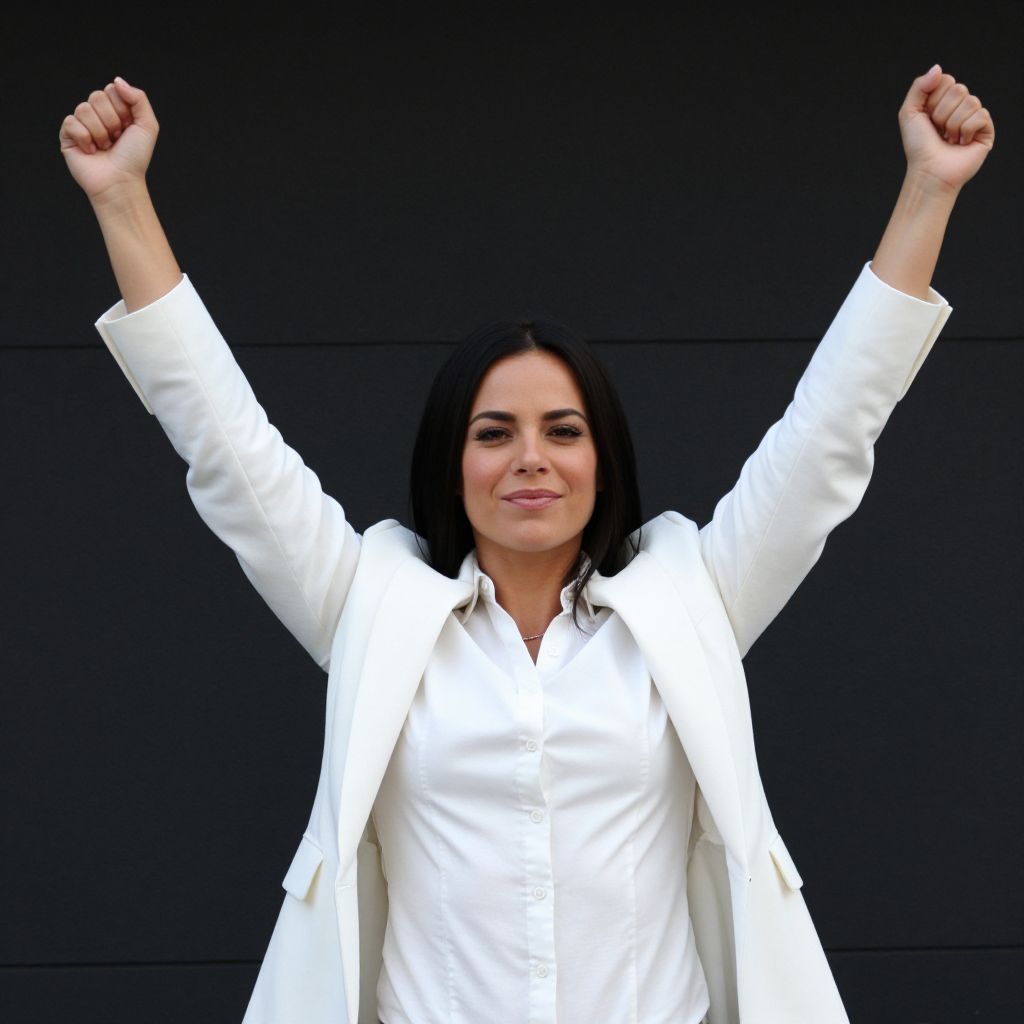 Photograph of a smiling middle-aged woman with dark hair, wearing a white blazer and shirt, raising both arms triumphantly against a black background.