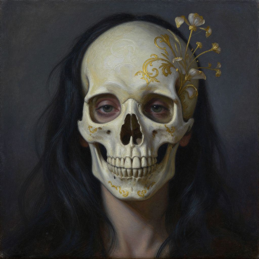 The image presents a hyperrealistic, oil-on-canvas painting by Mark Brooks, featuring a striking and enigmatic composition. Dominating the scene is a woman's face, which seamlessly transitions into a skull, creating a haunting and surreal effect. The woman's hair, dark and flowing, frames her face, while the skull is adorned with intricate, golden patterns and a delicate floral arrangement, adding a layer of complexity and depth. The background is a dark, twilight hue, enhancing the mysterious and somber atmosphere. The painting is rich in texture, with detailed brushstrokes and a high level of realism, capturing the fine lines and shadows that give the image a three-dimensional quality. The overall composition is balanced, with the skull and woman's face centrally aligned, drawing the viewer's eye to the central theme of the artwork. The use of light and shadow creates a sense of depth and dimension, making the image appear almost tangible. The painting is a testament to the artist's skill in blending realism with surreal elements, creating a piece that is both visually captivating and thought-provoking.