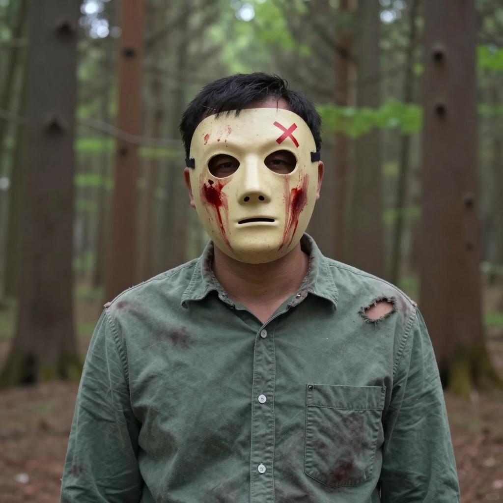 Man wearing a blood-stained, cream-colored mask with black holes and a red "X" on the forehead, standing in a forest. He has a green, torn, button-up shirt with visible blood stains. Tall trees with brown bark and sparse green leaves are in the background. Mask is worn over his head, eyes and mouth not visible. Foreground focused on man's upper body. Forest background slightly blurred.