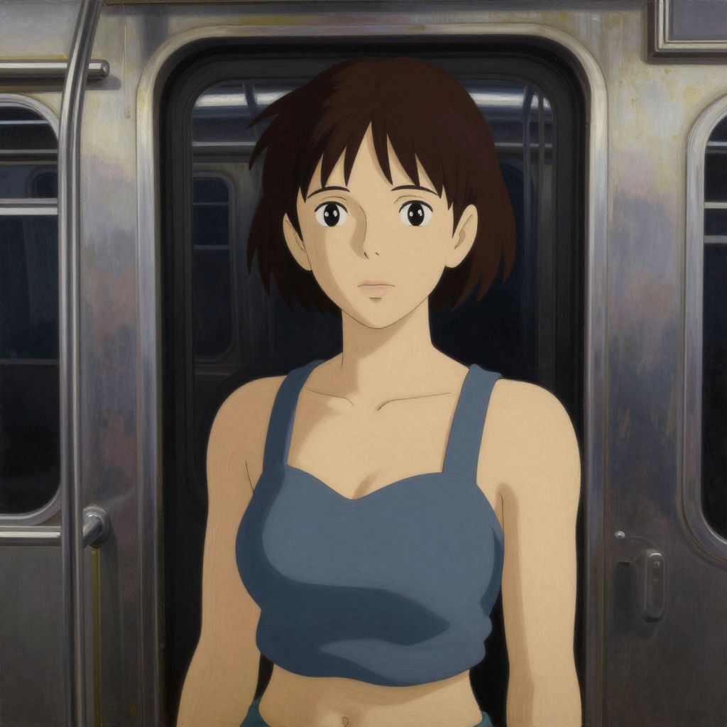 Woman wearing a crop top on a dark old subway train, dystopian, photorealistic oil painting, by yoshitaka amano, by studio ghibli, octane render, 4 k, close - up face, highly detailed subway train