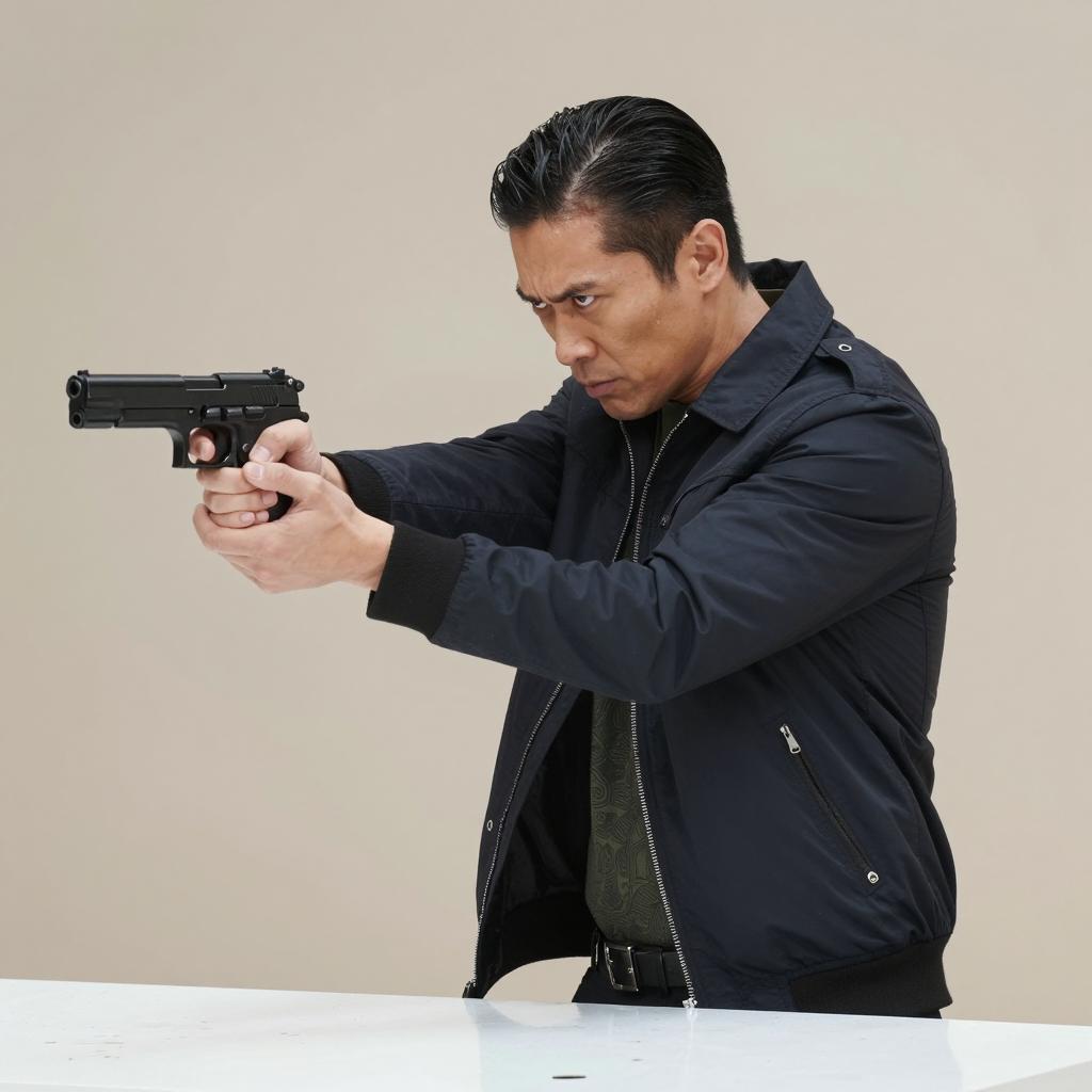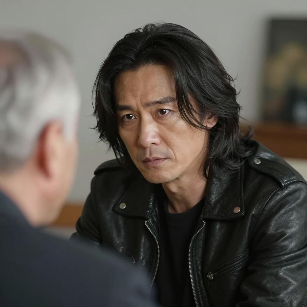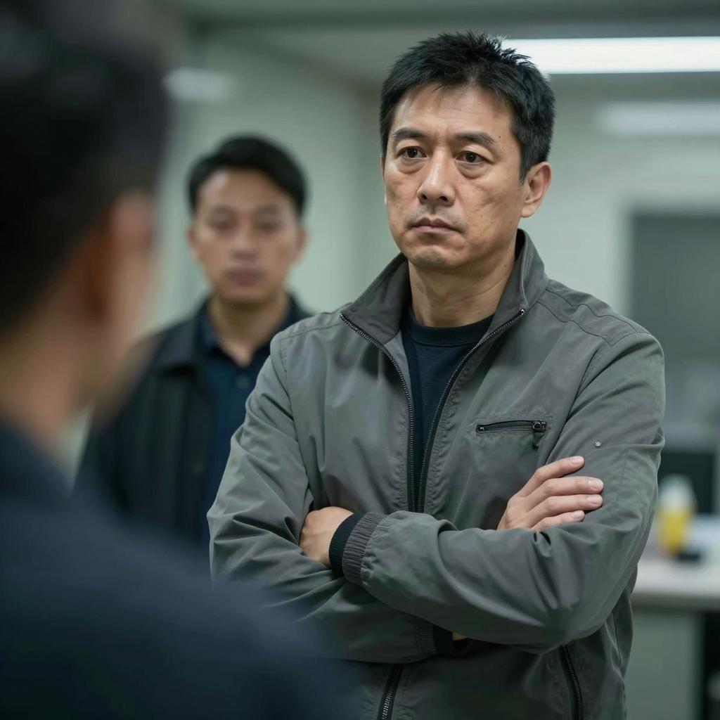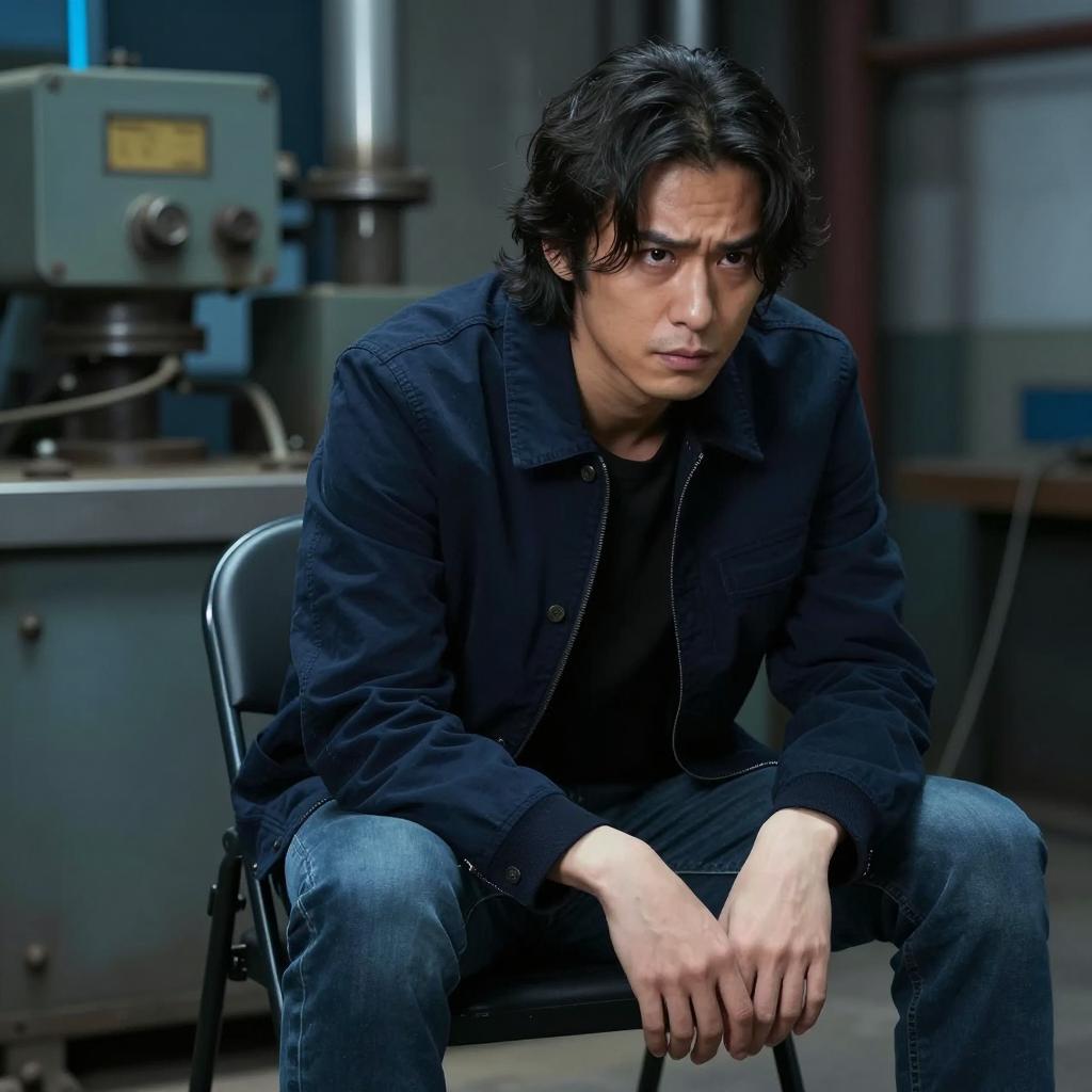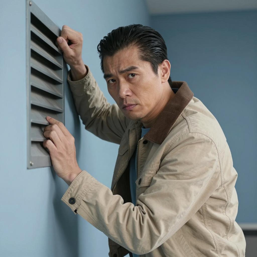 A man with dark, slicked-back hair, wearing a beige jacket, gripping a vertical metal vent with his right hand and left hand against a blue wall. His face shows a determined expression. Blue and light blue walls form the background. He is positioned slightly to the left.
