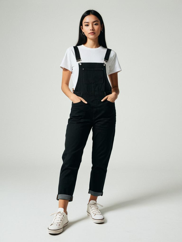 Woman, casual streetwear, black denim overalls, fitted silhouette, straight-cut leg, chest pocket, adjustable shoulder straps, layered over white short-sleeve t-shirt, low-top white canvas sneakers, neutral studio background. --sref 1399