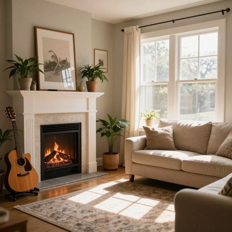 Cozy living room featuring a warm, glowing fireplace flanked by potted plants, a guitar leaning against the wall, and a comfortable beige sofa positioned beneath a large window with sunlight streaming through, complemented by a patterned rug and framed artwork above the mantel.