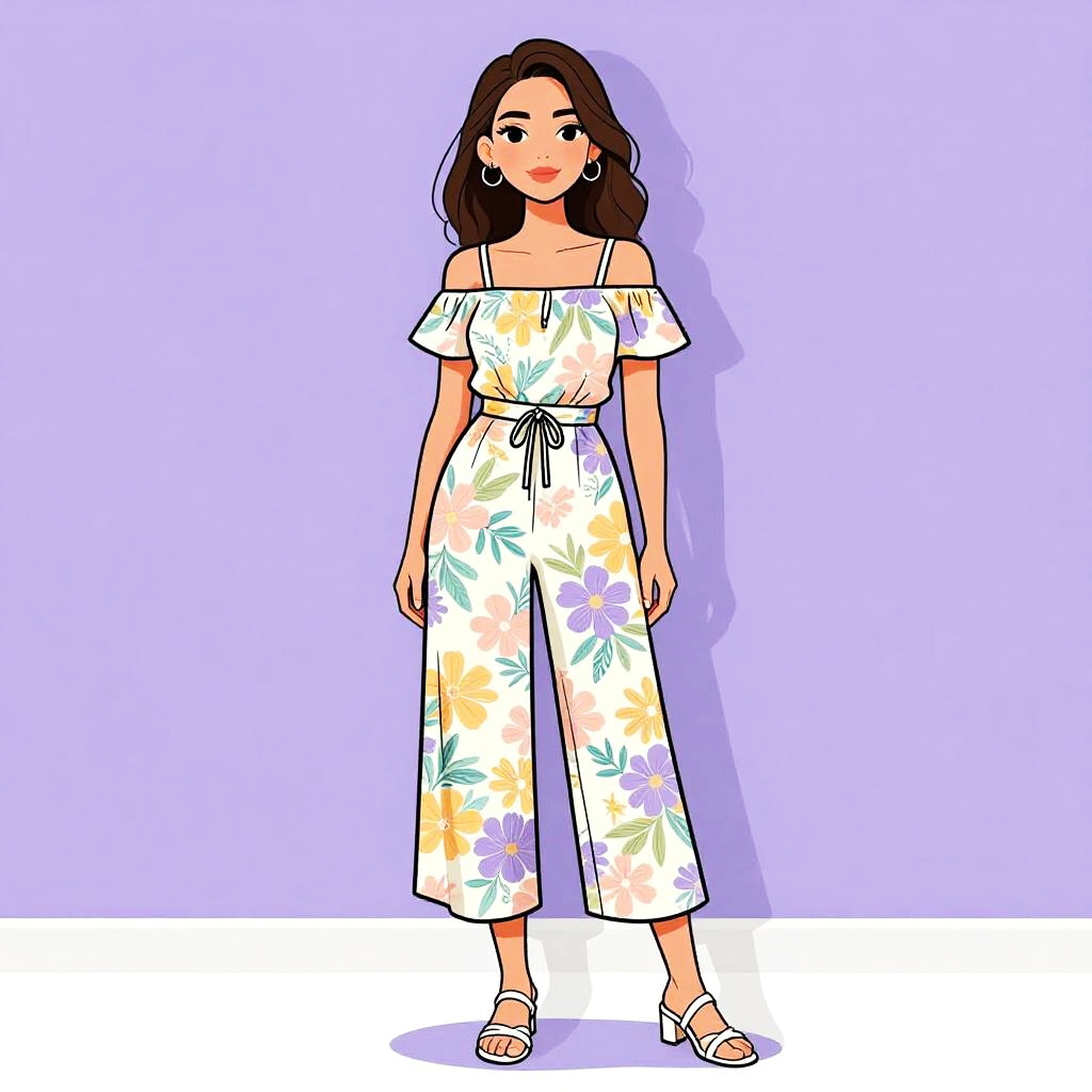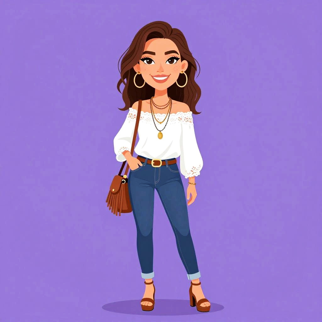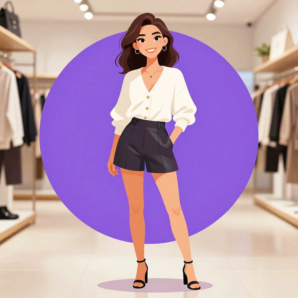 Woman with pretty face and pretty hair. Woman, bohemian chic, white off-the-shoulder blouse with wide, long bell sleeves, gathered elastic neckline, dusty pink high-waisted shorts with tie waist, beige strappy sandals with lace-up detail around the ankle, minimal jewelry, casual indoor retail space background with soft lighting. --sref 1467