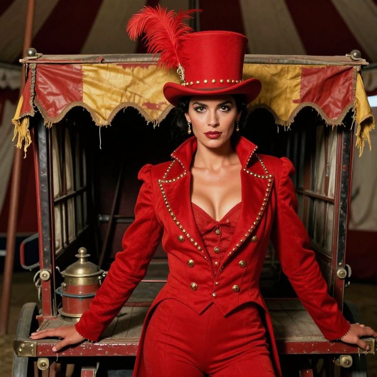 A striking circus performer, a Ringmaster lady in a red embellished tailcoat and a dramatic red top hat with a feather and gold studs, posing dramatically on a vintage circus wagon with tattered red and gold banners, surrounded by old-fashioned circus equipment, her face has a sharp nose, strong cheekbones, and a warm tan complexion, her gaze intense and proud, captured in a cinematic, grainy film-style photograph.