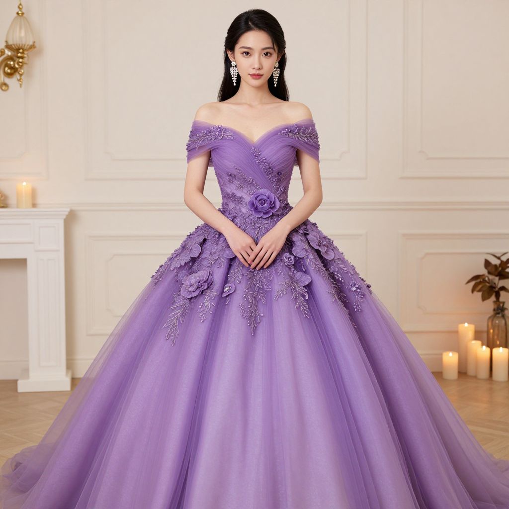 Purple ball gown wedding, 1girl, dress, solo, black hair, purple dress, flower, candle, jewelry, indoors, looking at viewer, off shoulder, off-shoulder dress, earrings