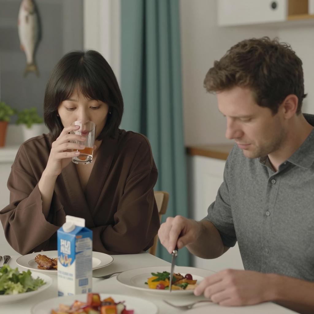 Five young adults, three men and two women of diverse ethnicities, sitting around a wooden dining table sharing a meal. Casual indoor setting with dim, warm lighting. The man at the center wears a brown sweater, one woman has curly hair wearing an olive green top, and another man on the right wears a red shirt. Plates of food, drinks in cups, a bowl of salad, and a covered dish are arranged on the table. Potted plants sit on a windowsill behind them in a cozy dining room.