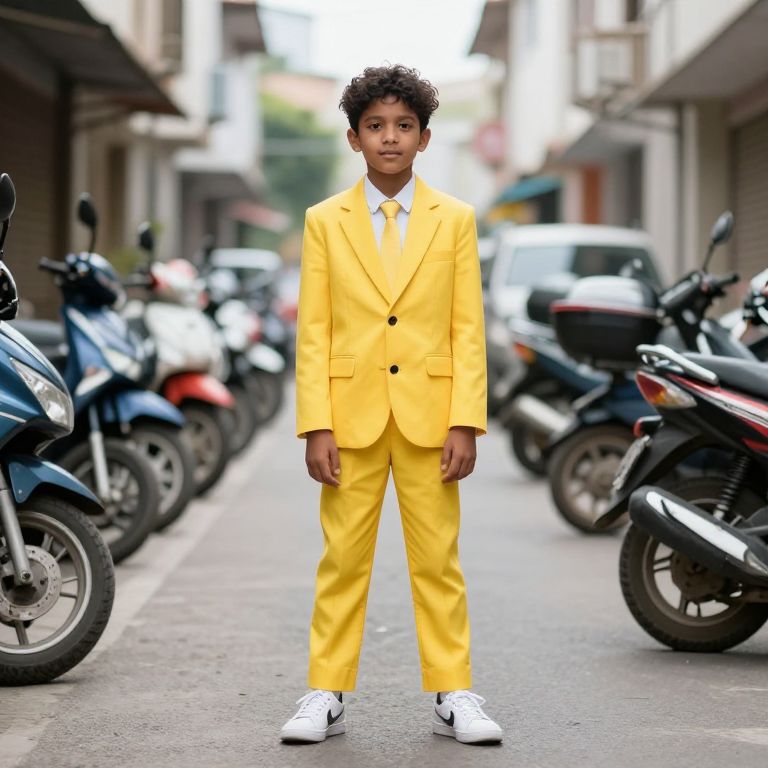 Yellow Suit, boy in yellow suit standing in middle of street with parked motorcycles
